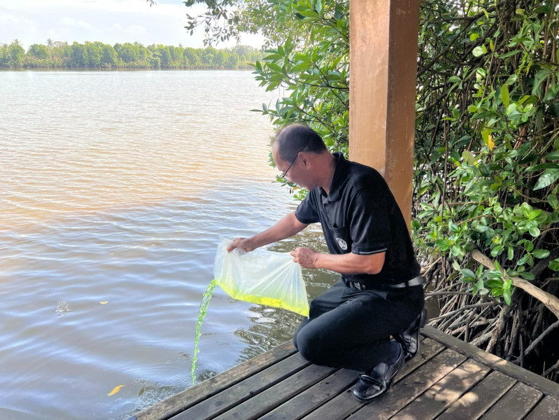 จากนั้นได้ร่วมปล่อยพันธุ์สัตว์น้ำ ซึ่งเป็นพันธุ์ปลากะพงขาว จำนวน 5,000 ตัว ณ บริเวณศาลาท่าน้ำวัดชลธาราสิงเห ตำบลเจ๊ะเห อำเภอตากใบ จังหวัดนราธิวาส