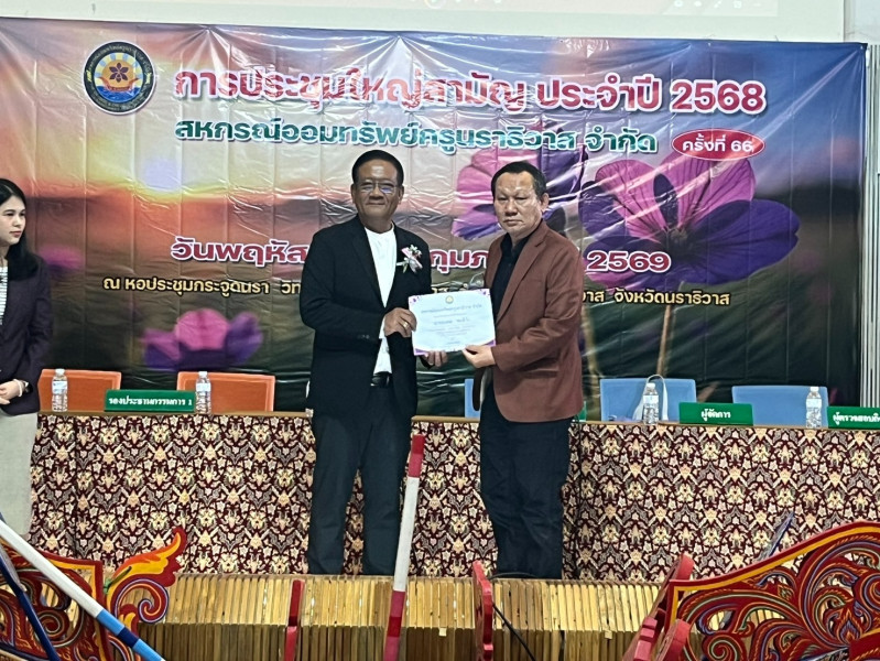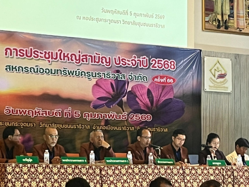 วันที่ 5 กุมภาพันธ์ 2569 นายธัชพงศ์ บัวนุช สหกรณ์จังหวัดนราธิวาส ได้เป็นเกียรติมอบโล่ประกาศเกียรติคุณ ให้กับกรรมการ เจ้าหน้าที่สหกรณ์ สมาชิกดีเด่น และผู้ที่มีคุณูปการให้กับสหกรณ์ออมทรัพย์ครูนราธิวาส จำกัด และมอบหมายให้ นางสาวศิรดา หามะ ผู้อำนวยการกลุ่มส่งเสริมสหกรณ์ 1 (อำเภอเมือง บาเจาะ ยี่งอ) เข้าร่วมประชุมใหญ่สามัญประจำปีสำหรับปีบัญชี 31 ธันวาคม 2568 ณ หอประชุมกระจูดนรา วิทยาลัยชุมชนจังหวัดนราธิวาส เพื่อรับทราบผลการดำเนินงาน โดยสหกรณ์มีผลการดำเนินงานกำไรสุทธิจำนวน 342,390,579.55 บาท มีทุนดำเนินงานทั้งสิ้นจำนวน 8,703,157,860.47 บาท การประชุมใหญ่เป็นไปด้วยเรียบร้อย ภายใต้ข้อบังคับและกฎหมายสหกรณ์